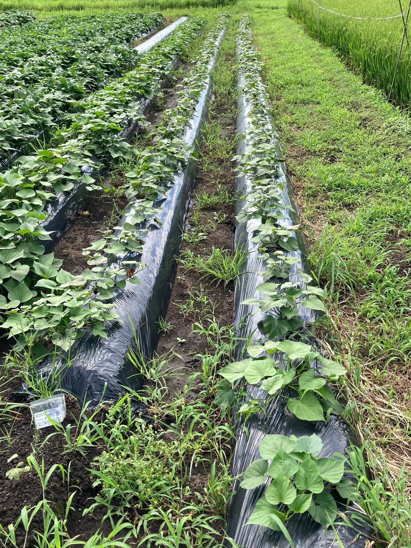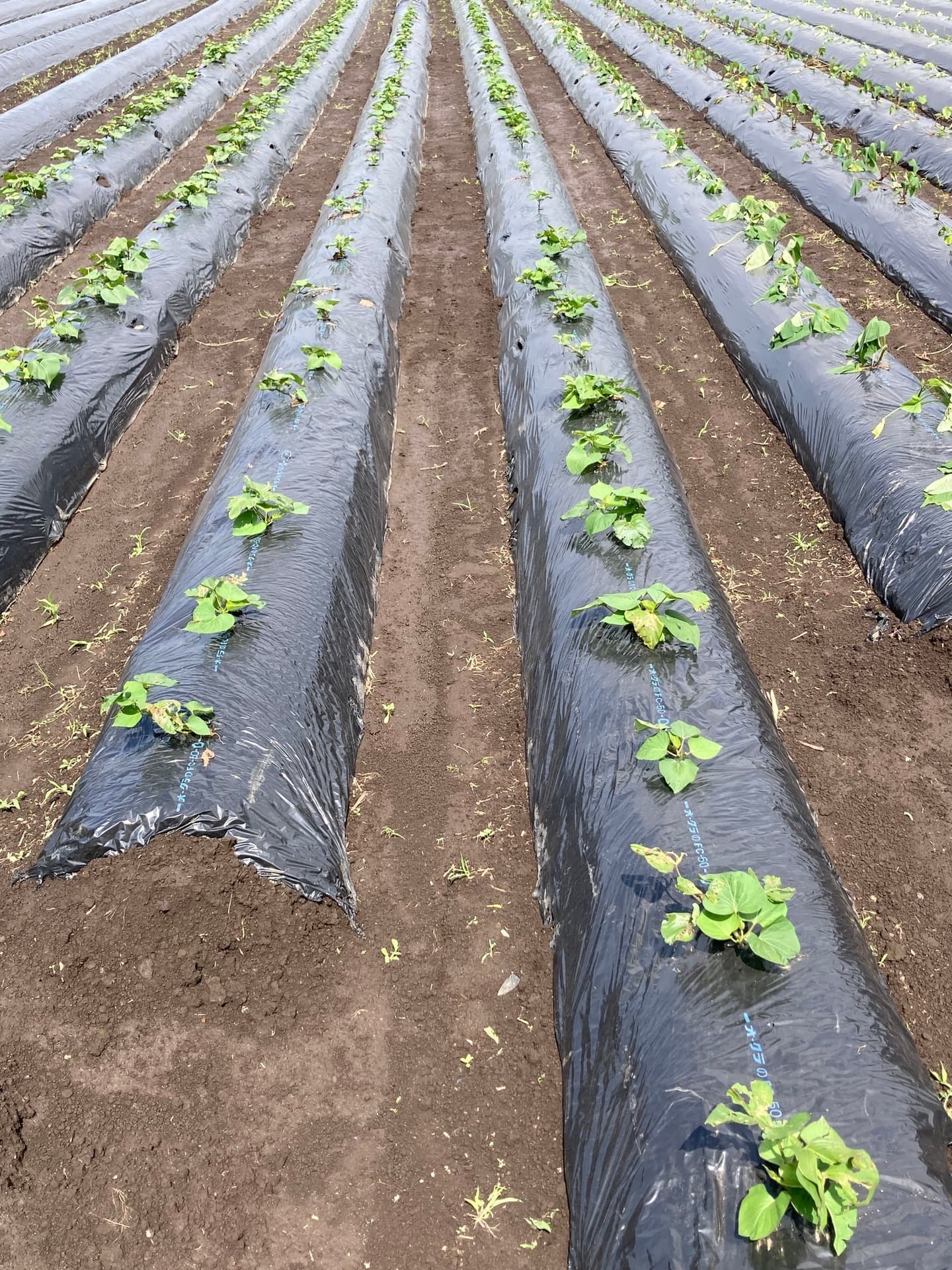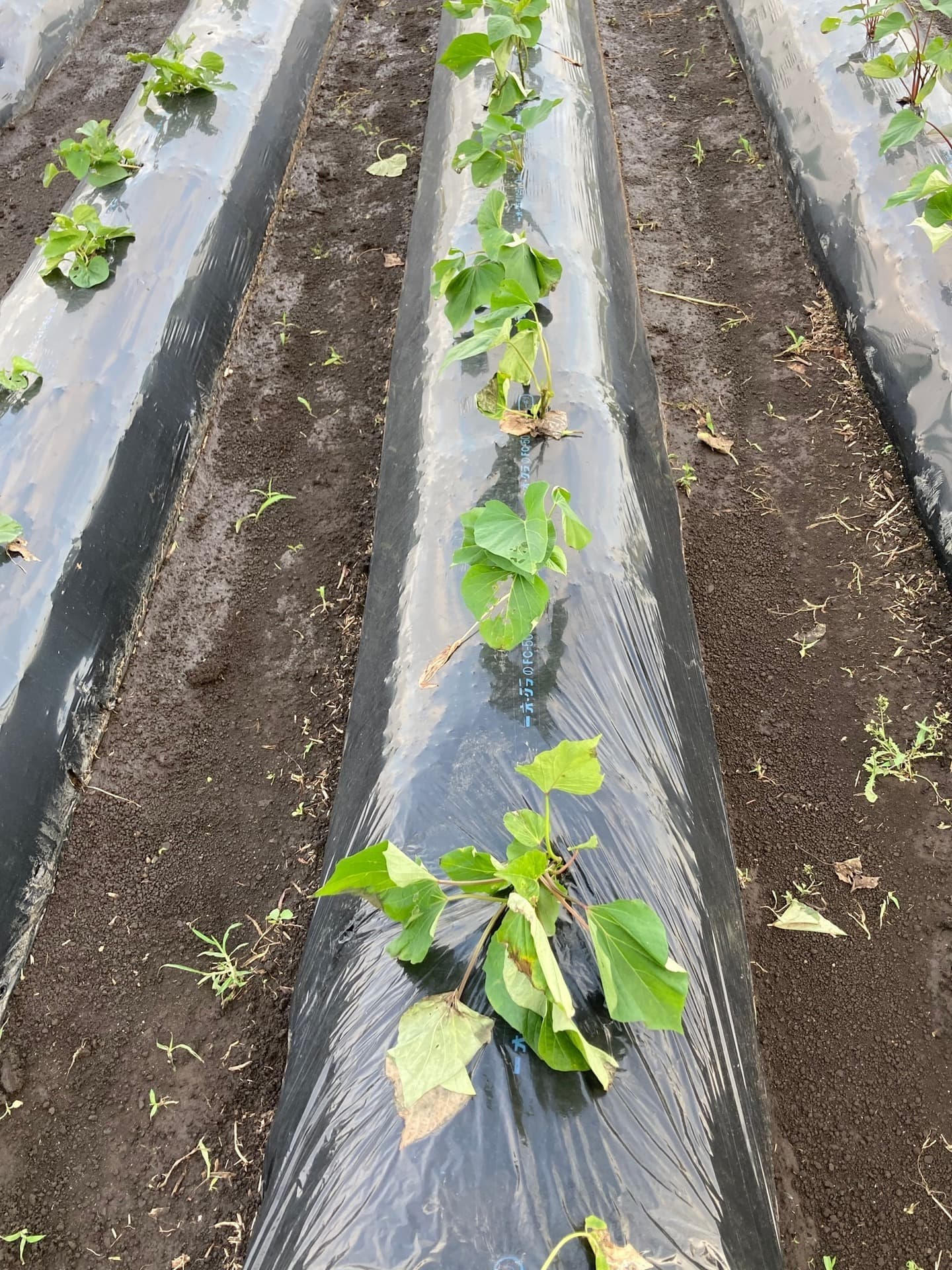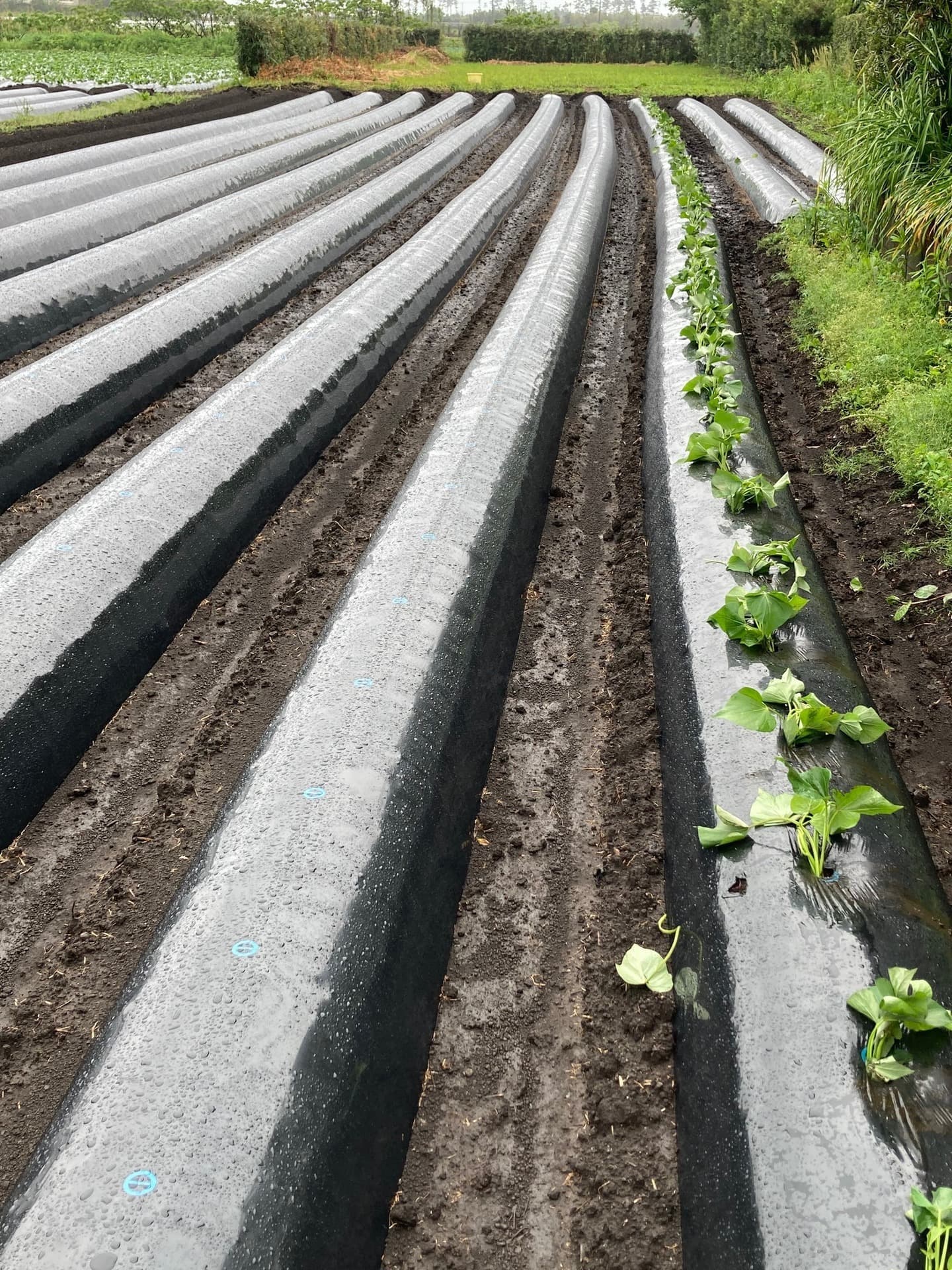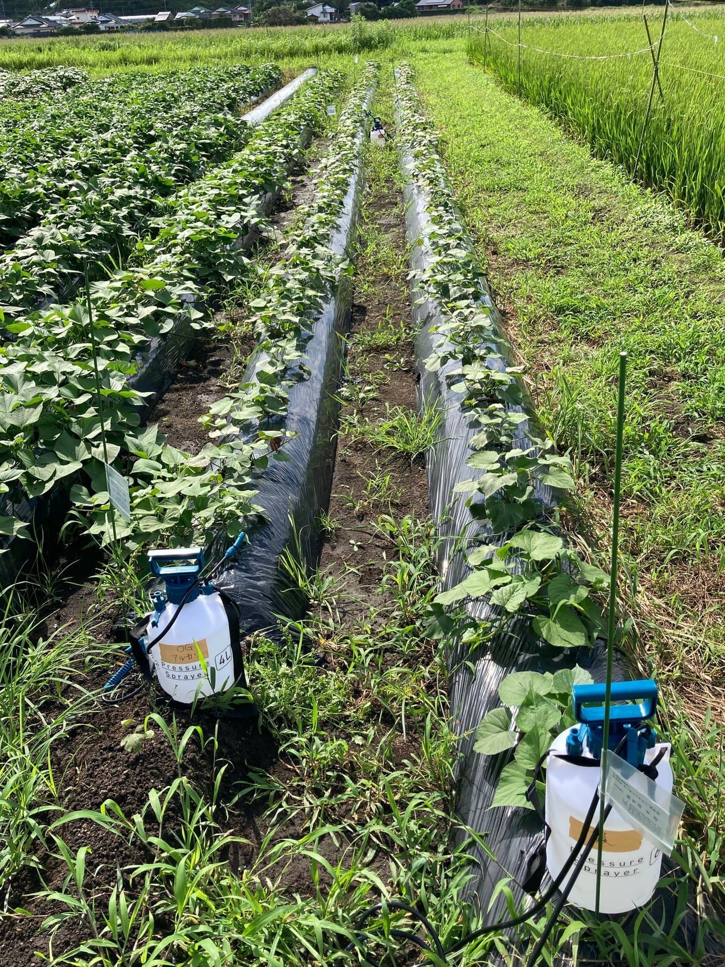今年は昨年の経験を活かして、土壌消毒、苗のオーガニック消毒、オーガニック散布と続いて基腐れ対策に臨んでおります。苗の品種も紅マサリ、高系14号、紅はるか、紅さつま、安納芋、ヤマダイカンショと多品種で成果を見たいと思っています。定着後、オーガニック散布した苗は立ちます。