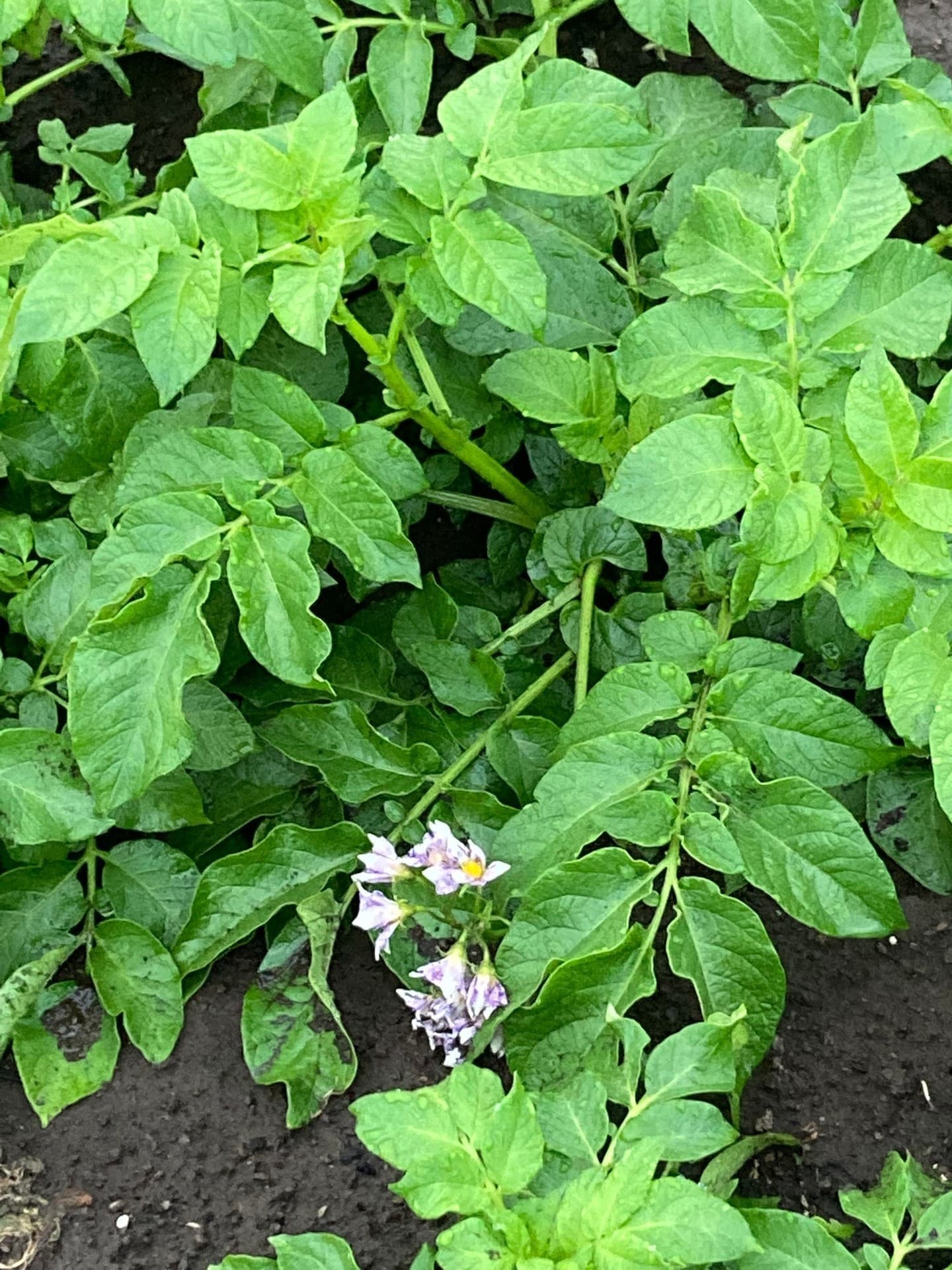3月に植え替えたじゃがいも君たち、北風に枝を折られながらも生き抜き、花を咲かせるまでになりました。出荷はまだまだ先のことです