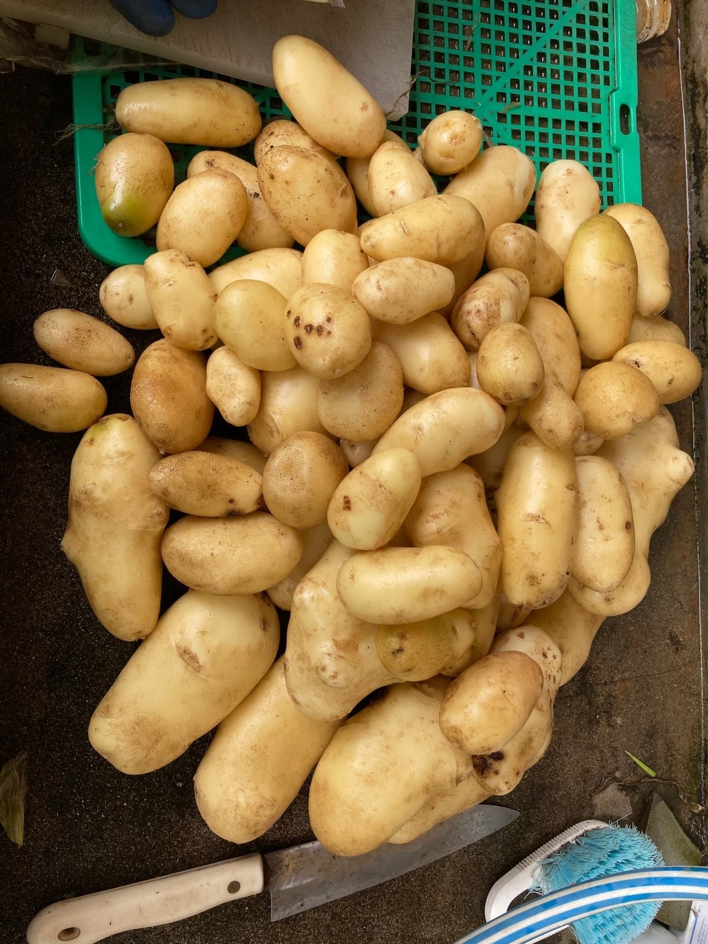 ジャガイモの成長の記録をまとめておきましょう。今年の1月12日に種芋を植え付け、2月26日に植え替えをし、5月8日に収穫を開始しました。種芋はオーガニックに浸し、ビニルハウスの中で芽吹いた後オーガニック散布し、植え替えた後も同様に散布して育てました。現在、収穫中ですが収量を計測中です。