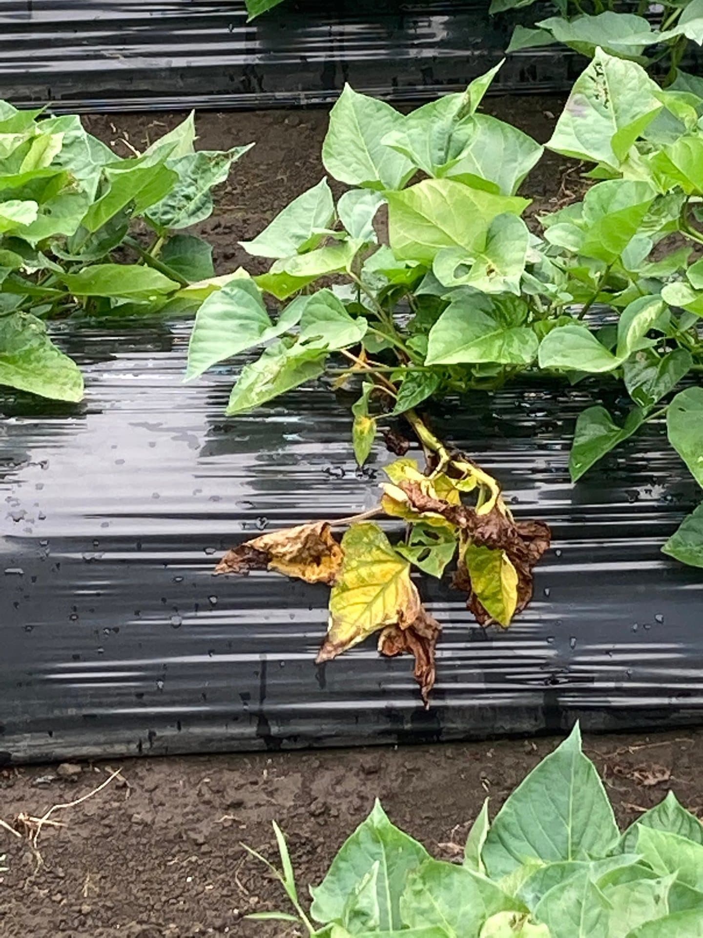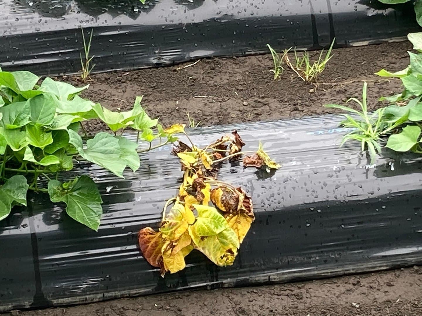 近くの薩摩芋畑を観察すると基腐病と思われる症状の苗発見。我が家の畑は全く発生しておりませんが、梅雨の季節危険が迫っています。