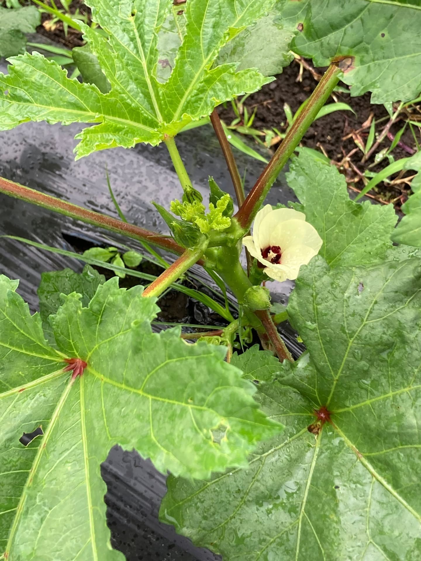 4月初めに種まきをした五角オクラ。花を咲かせ始めました。オクラの季節が始まります。