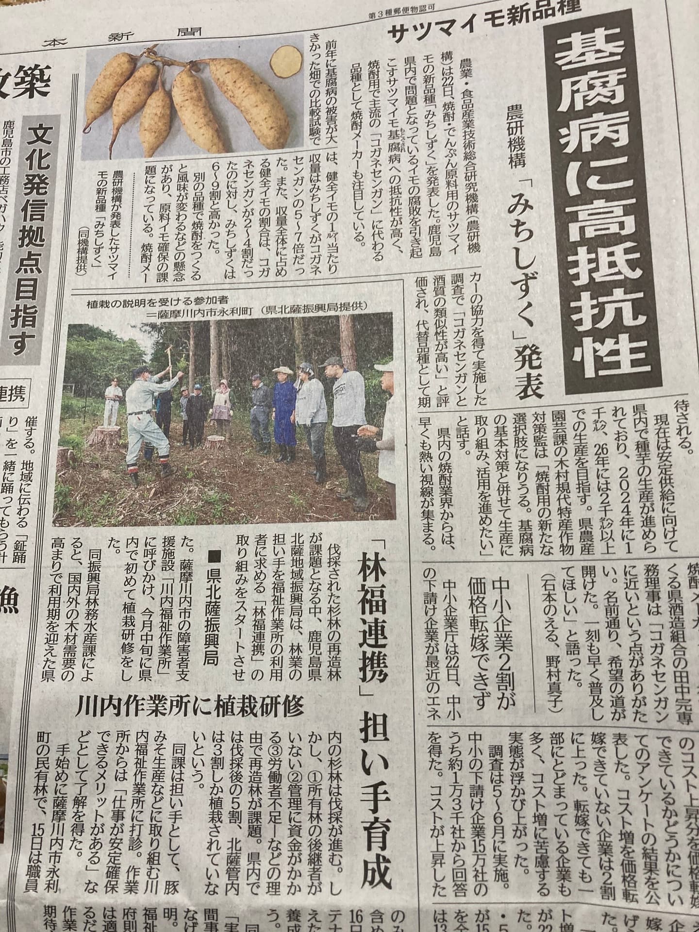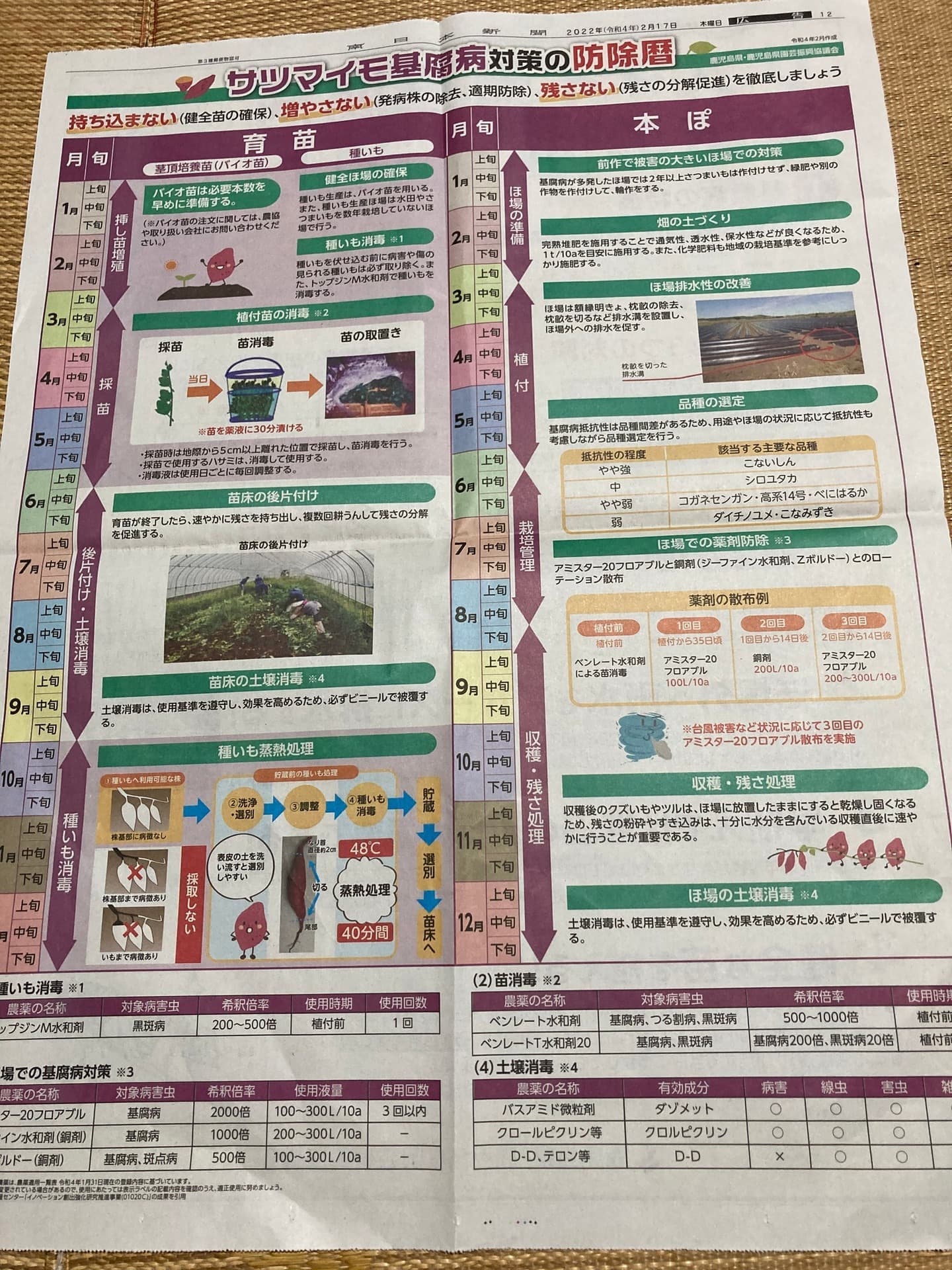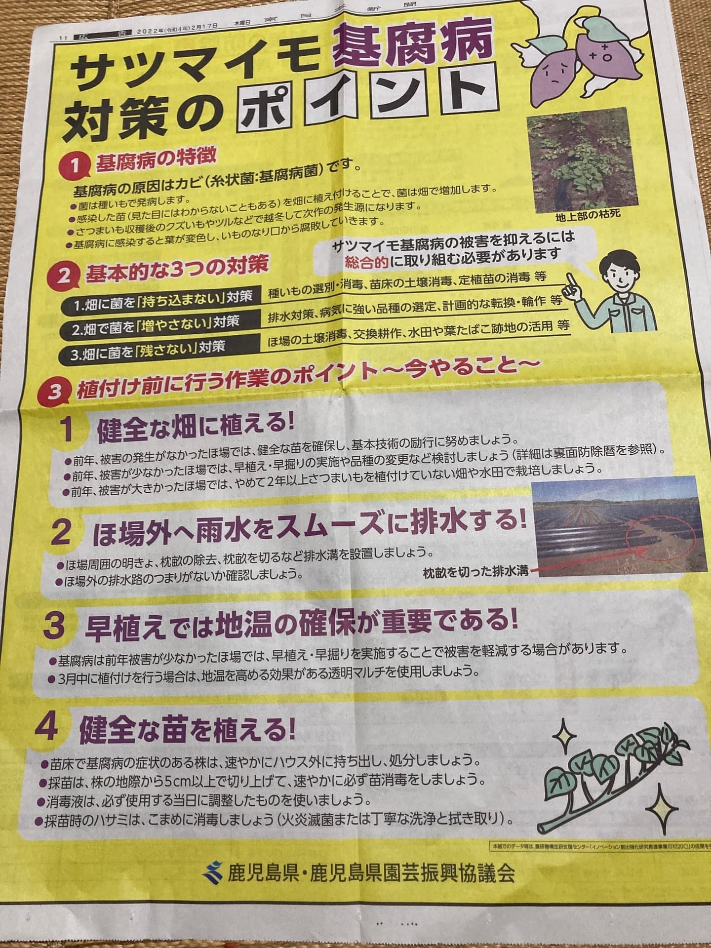 薩摩芋基腐病対策、朗報。昨年来、薩摩芋基腐病に対する各種薩摩芋の苗の抵抗性について報告して来ているところですが、農研機構より、黄金千貫にかわる高抵抗性の品種開発情報が報道されました。朗報です。